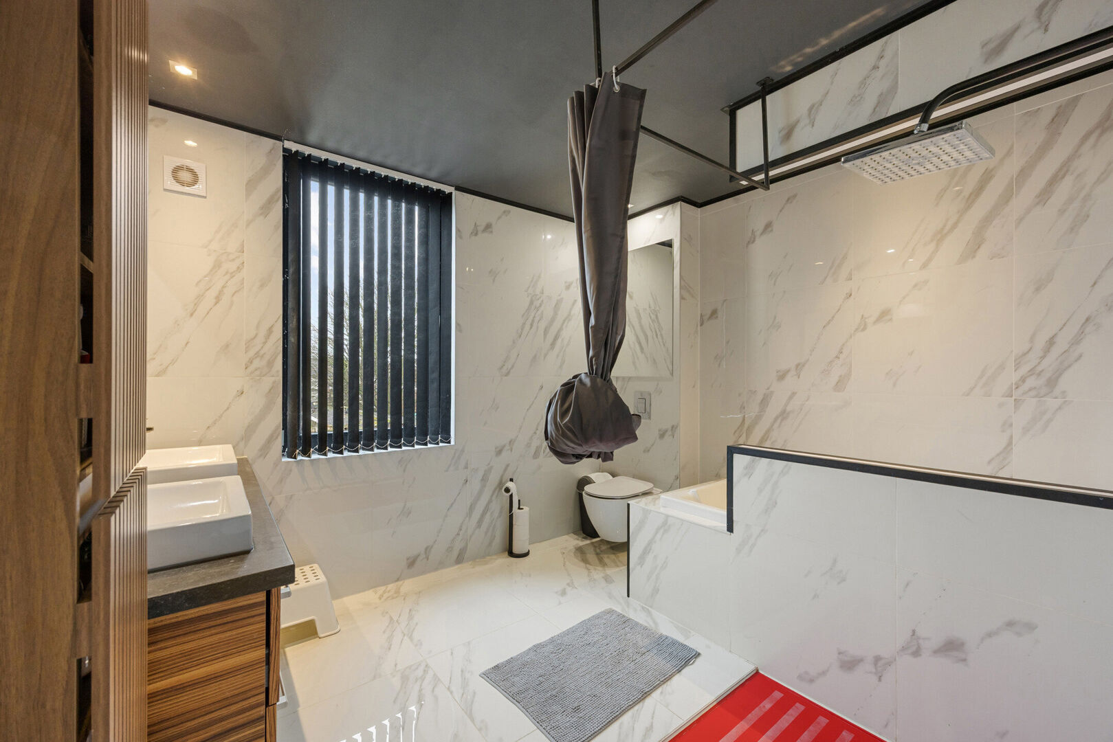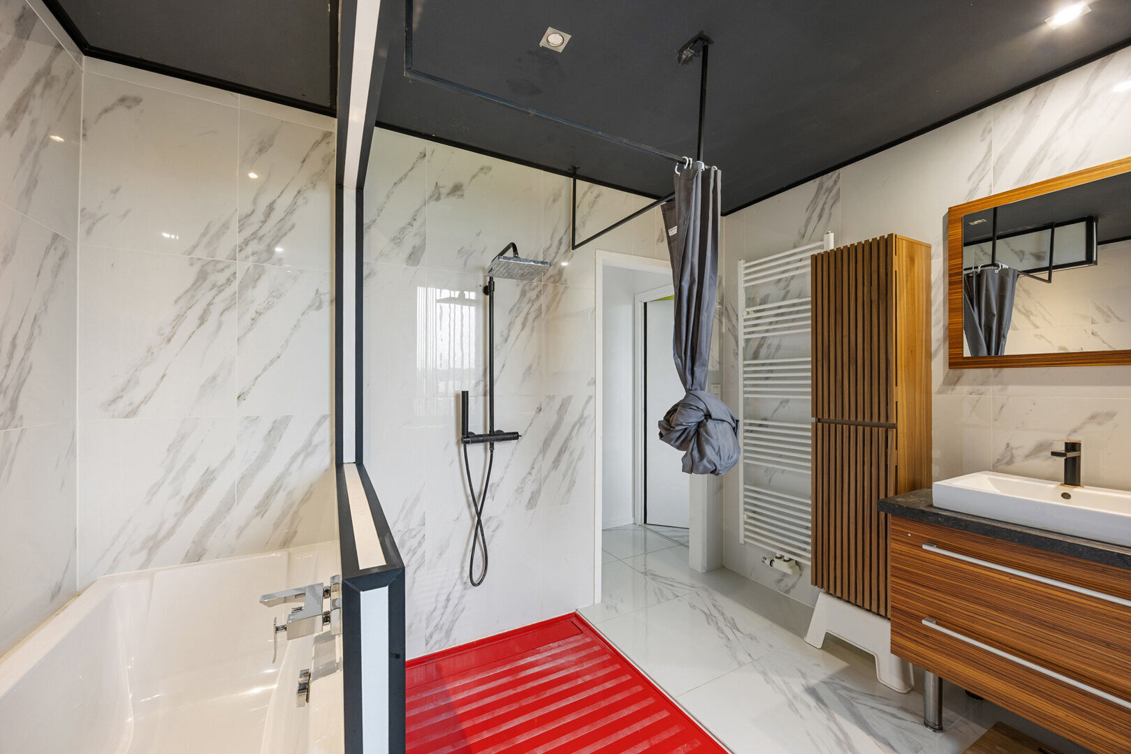 -Stijlvolle badkamer (8,70m2) voorzien van dubbele lavabo met wandmeubel, inloopdouche, ligbad en toilet.
