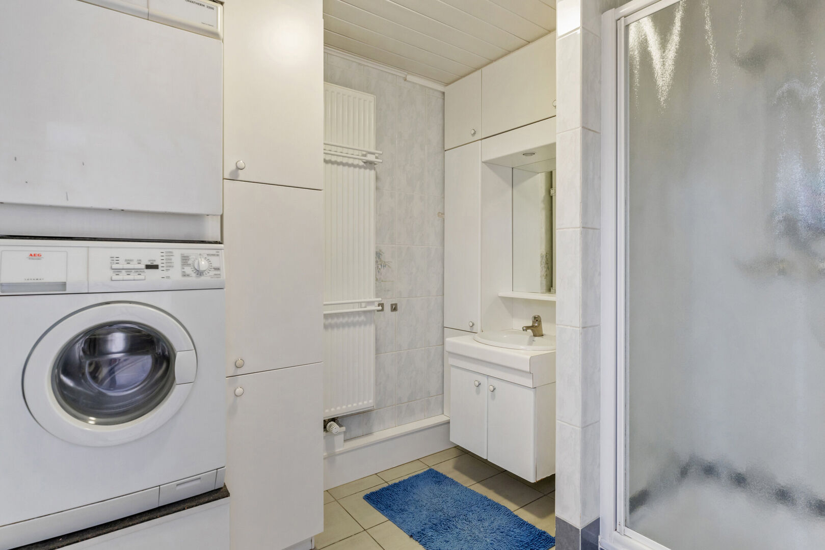 - Badkamer (4,37m2) voorzien van lavabo met wandmeubel, douche, toilet & aansluiting voor een wasmachine en droogkast.