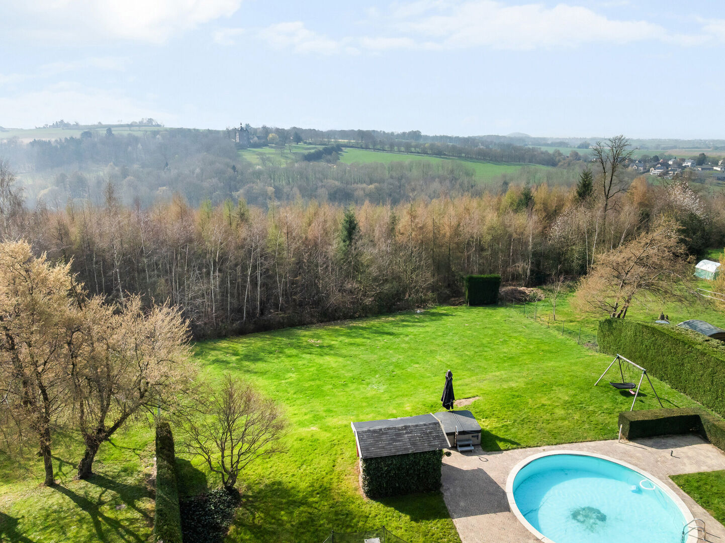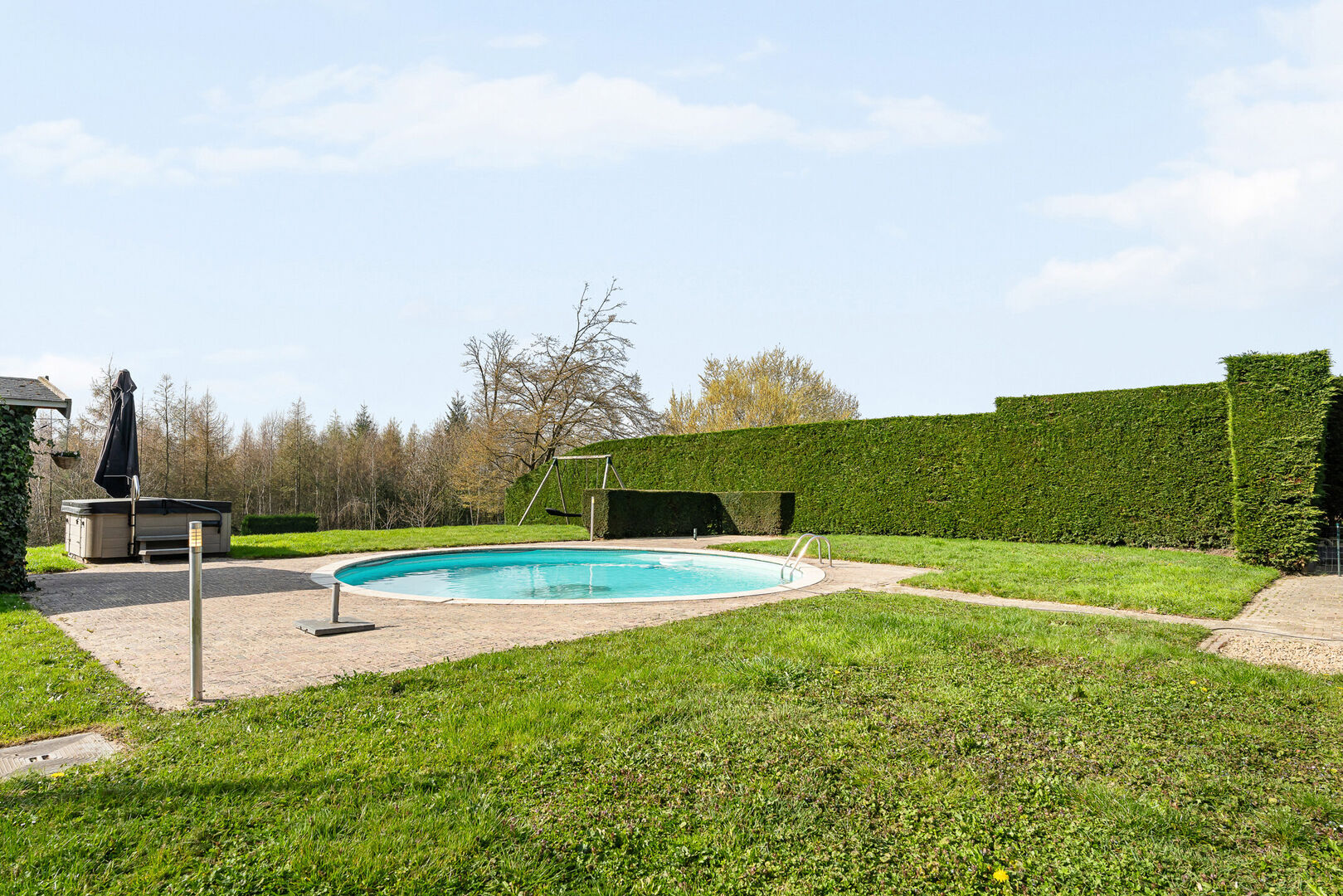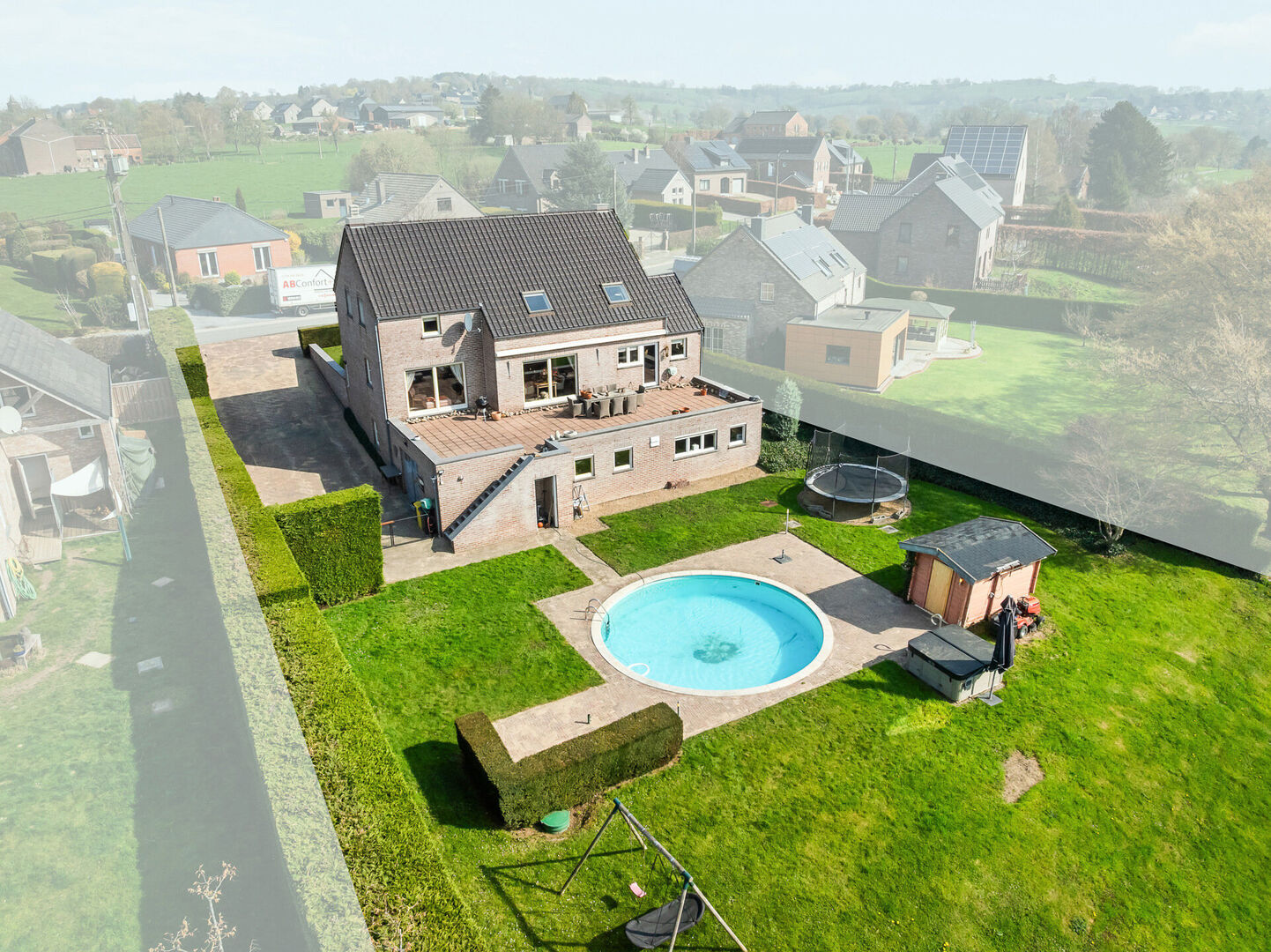 De woning is omringd door groen en beschikt over een zuid-terras en tuin met zwembad, ideaal om op warme zomerdagen af te koelen. De aanwezige zonneluifels zorgen steeds voor een aangenaam klimaat. Bovendien is er extra parkeergelegenheid voor of naast de woning.