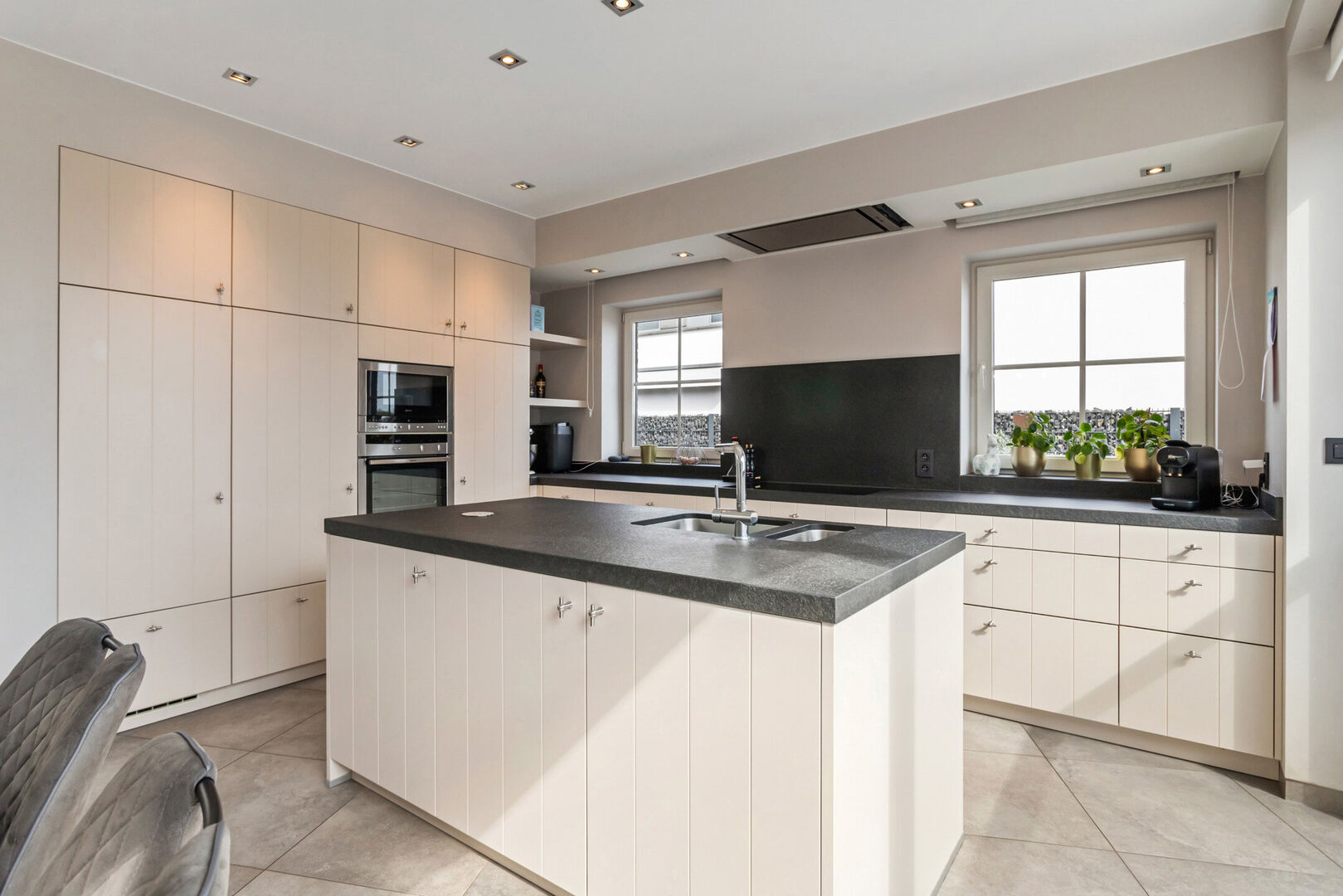 -De leefruimte met open keuken (tot. opp. 64,60m2) vormt één ruim, open geheel met aandacht voor natuurlijke lichtinval en een groen verzicht. De landelijke keuken met eiland is voorzien van alle gemakken: inductie kookplaat, graniet werkblad, afzuigkap, oven, magnetron, vaatwasser, koelkast. De schuifpui geeft uit op het royale terras waar het zalig vertoeven is.