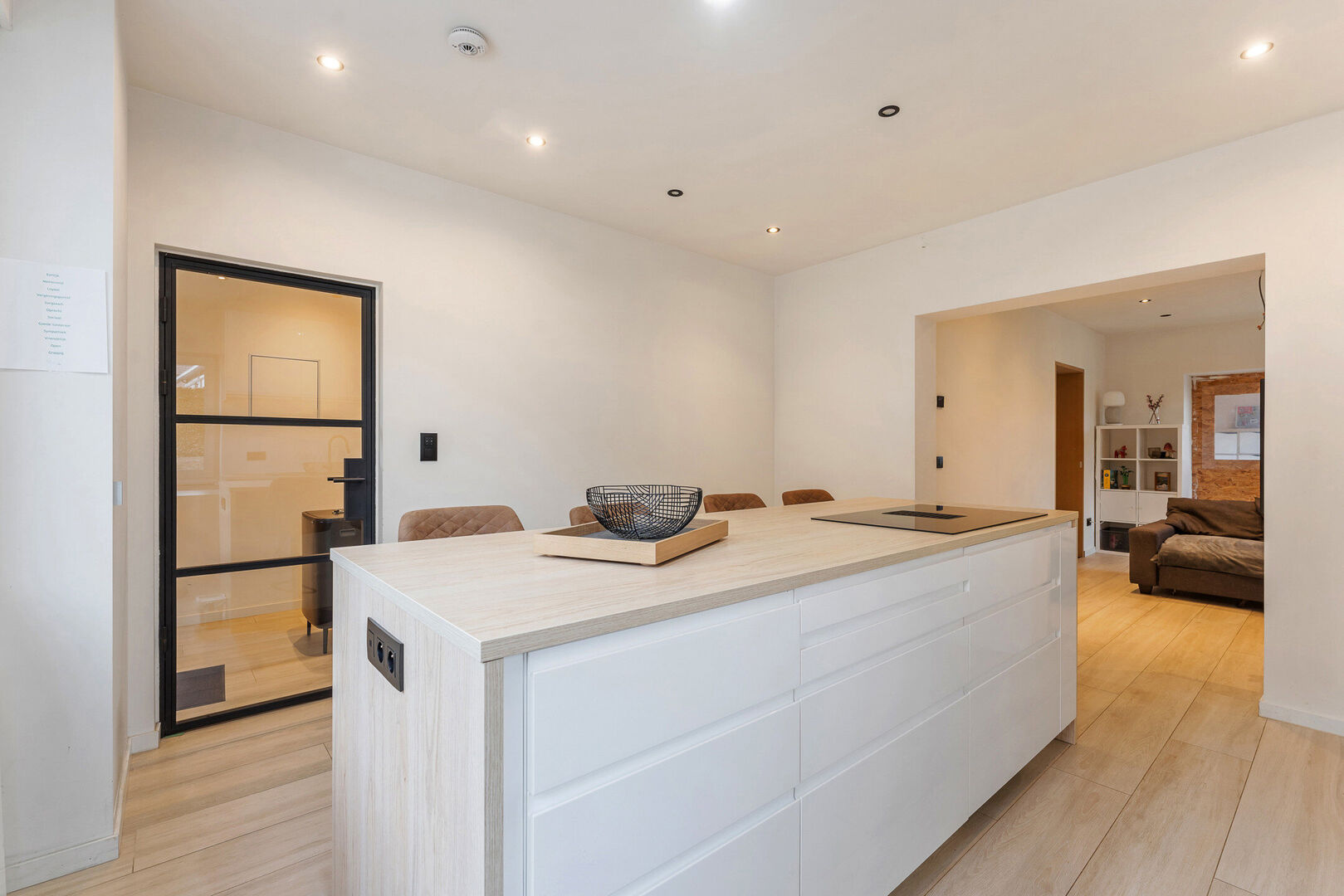 -Open leefruimte (30,41m2) onderverdeeld in een gezellige woonkamer en hedendaagse keuken met eiland. Deze is uitgerust met inductiekookplaat en geïntegreerde afzuiging, oven, combi-oven, vaatwasser, koelkast en diepvries.