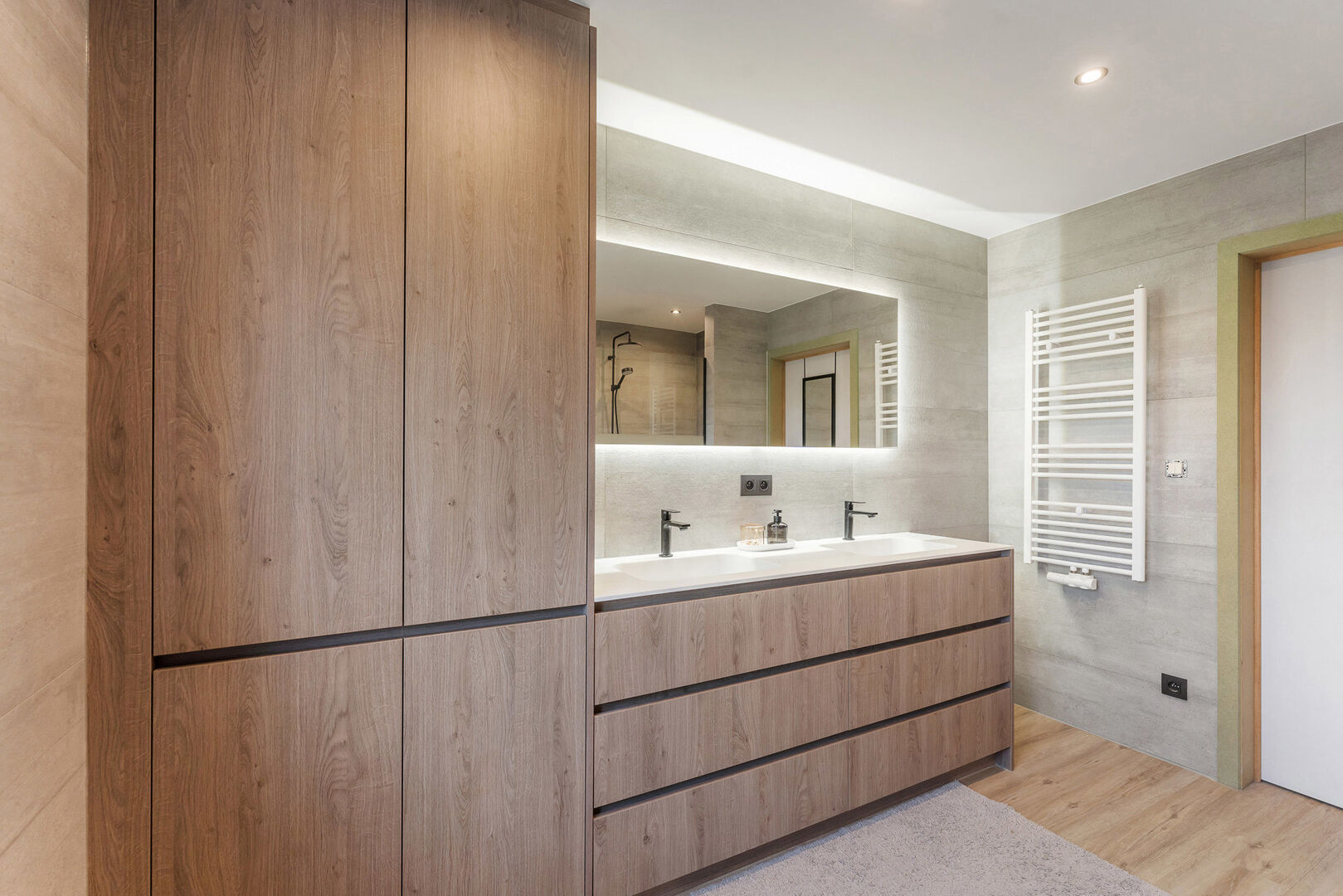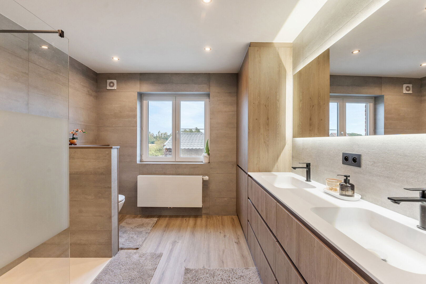 -Luxueus gerenoveerde badkamer met ruim wandmeubel met dubbele lavabo, moderne inloopdouche en toilet.