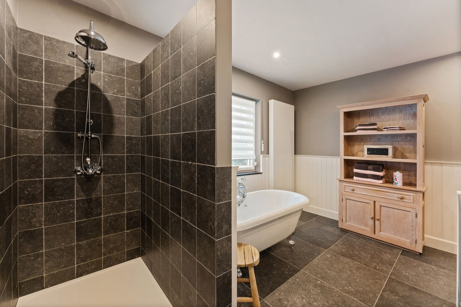 -Stijlvolle badkamer (12m2) voorzien van een vrijstaand ligbad, inloopdouche, dubbele lavabo en apart toilet.