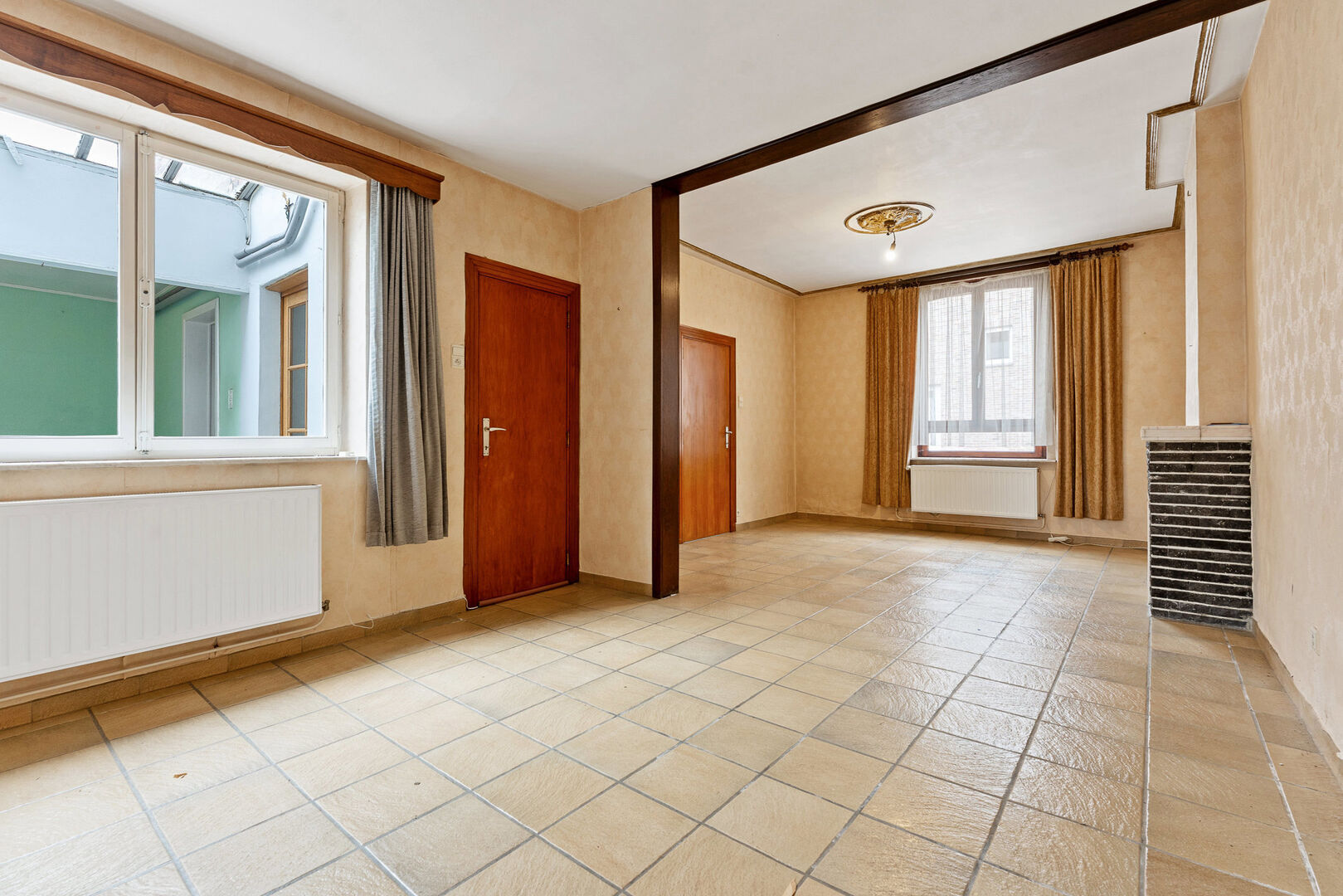 -Lichtrijke leefruimte onderverdeeld in eet- en woonkamer (28,66m2), waar authentieke elementen bewaard zijn gebleven.