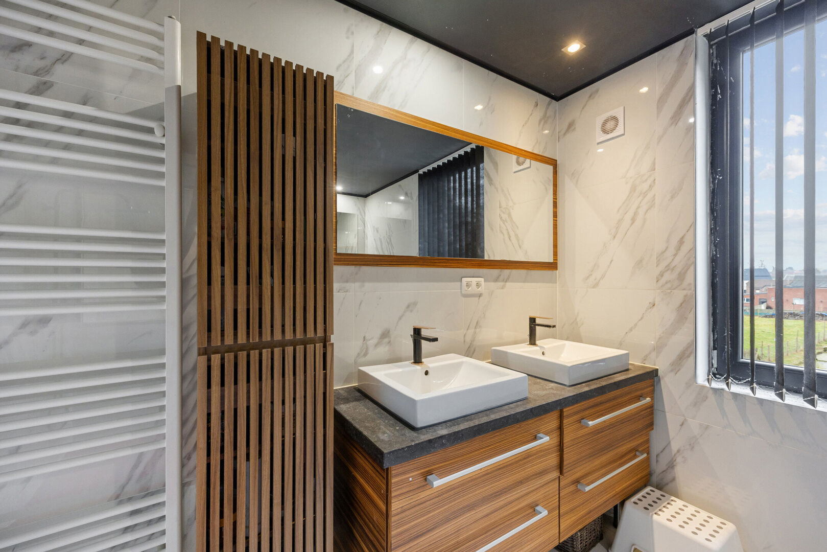 -Stijlvolle badkamer (8,70m2) voorzien van dubbele lavabo met wandmeubel, inloopdouche, ligbad en toilet.