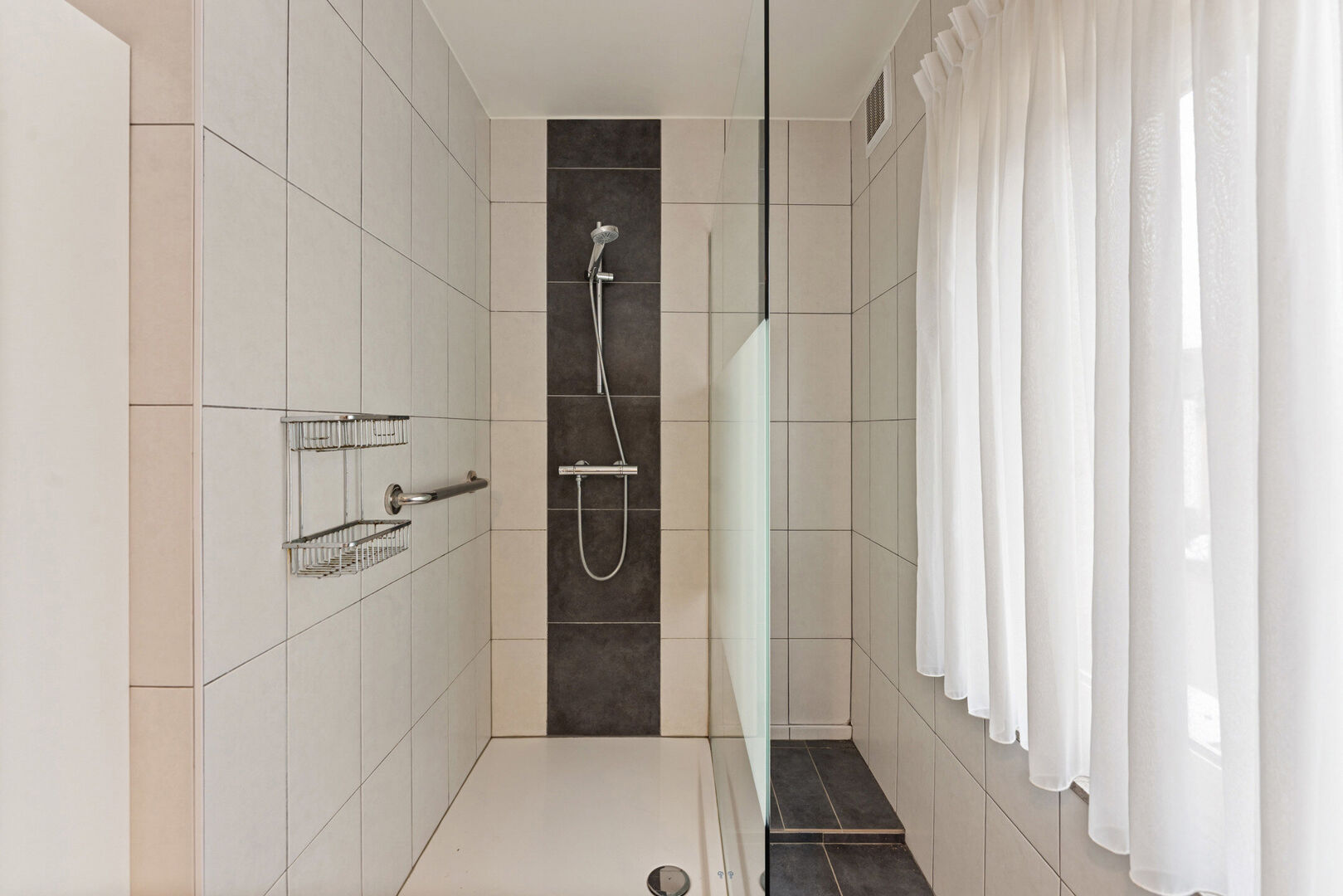 -Vernieuwde badkamer (5,74m2) met inloopdouche en een wandmeubel met lavabo.
