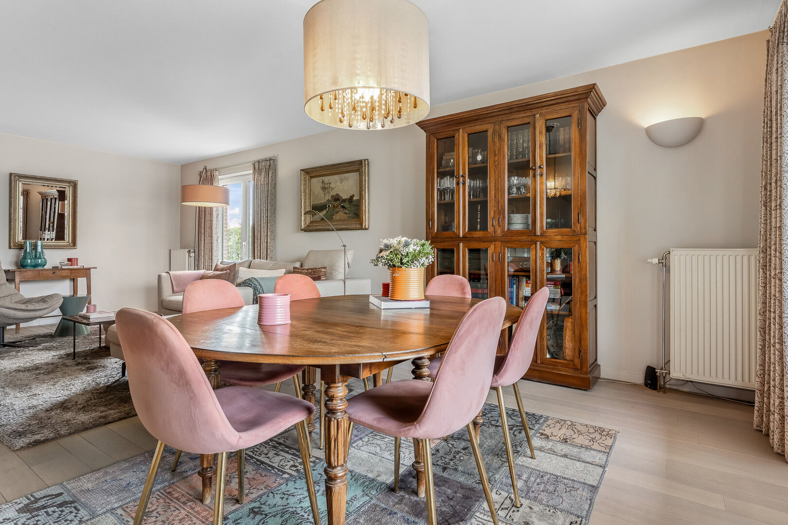 -De lichtrijke leefruimte (32,68m2), onderverdeeld in zit- en eethoek, straalt een natuurlijke warmte uit omwille van de parketvloer en de ingebouwde pelletkachel.