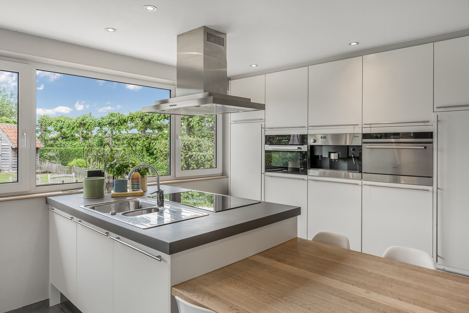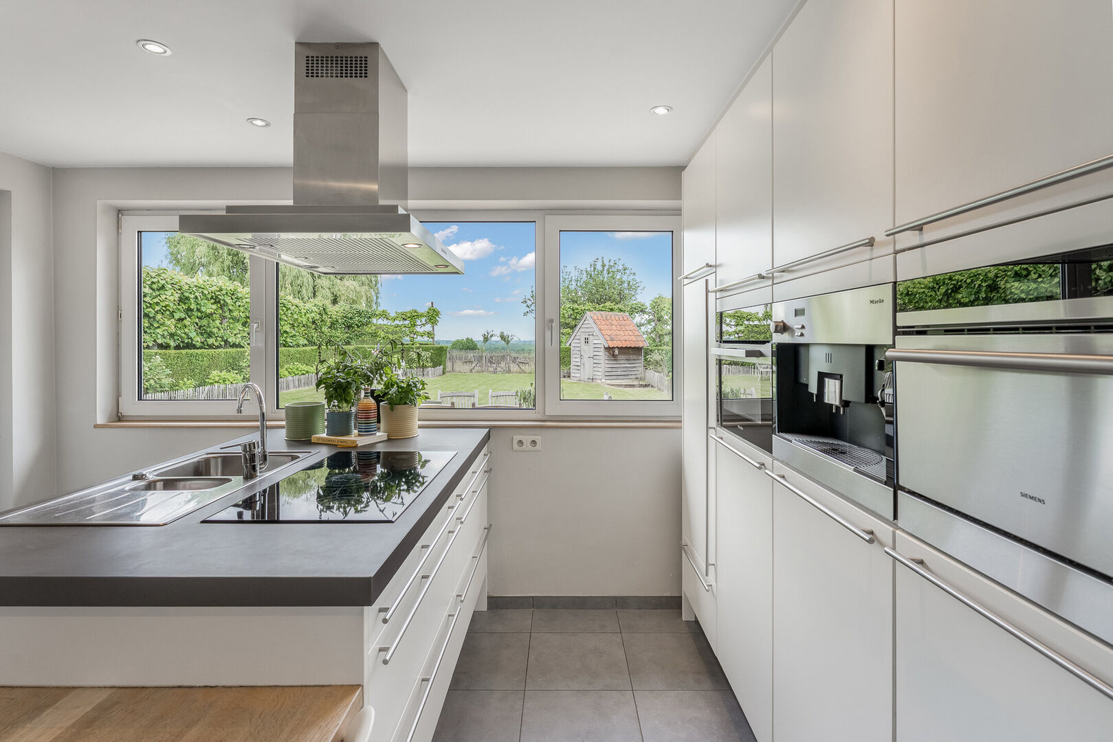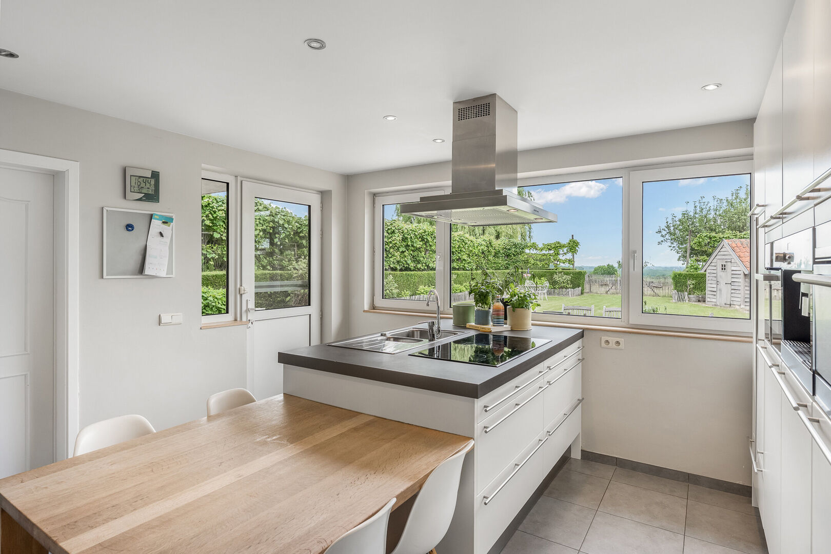 -Gerenoveerde keuken (17,20m2) met kookeiland en tuingerichte raampartijen. Alle hedendaagse comfort is hier aanwezig: Keramische kooplaat, afzuigkap, oven ,vaatwasser en een steamer.