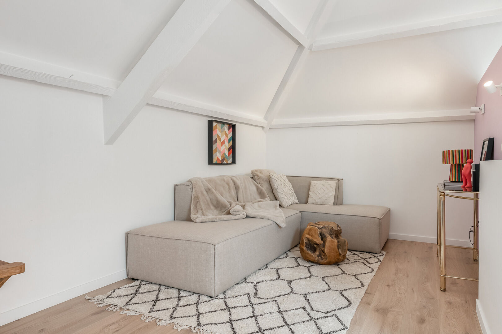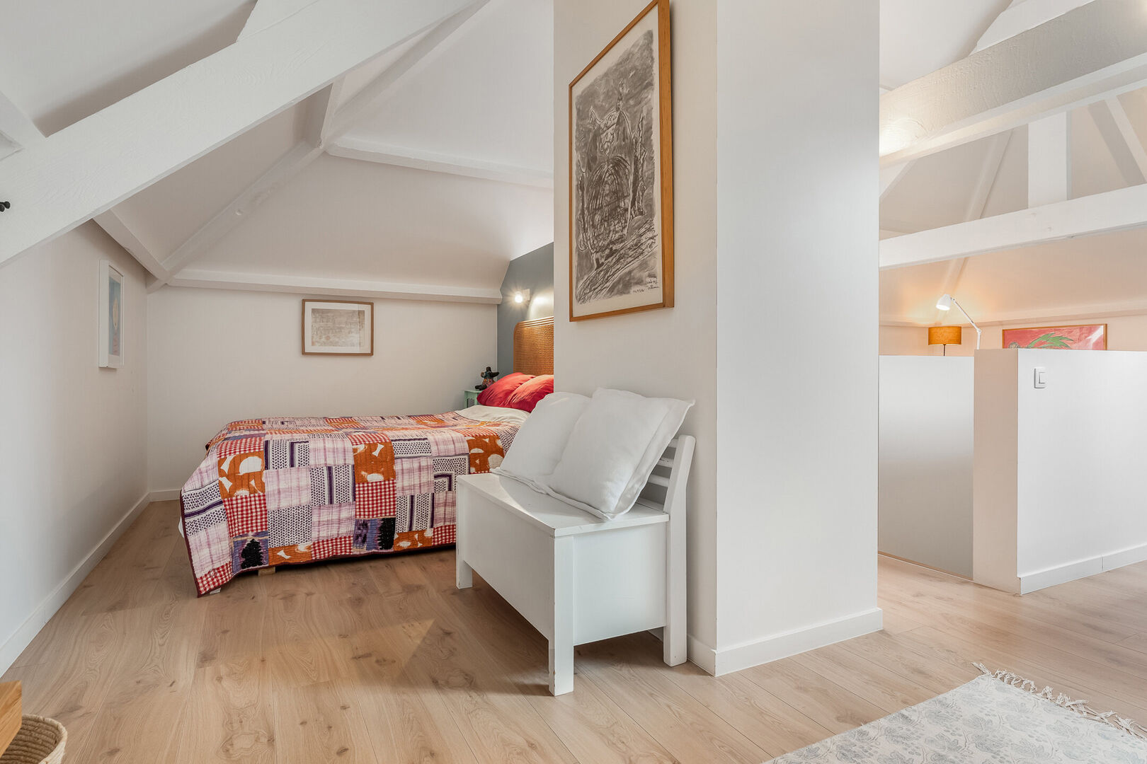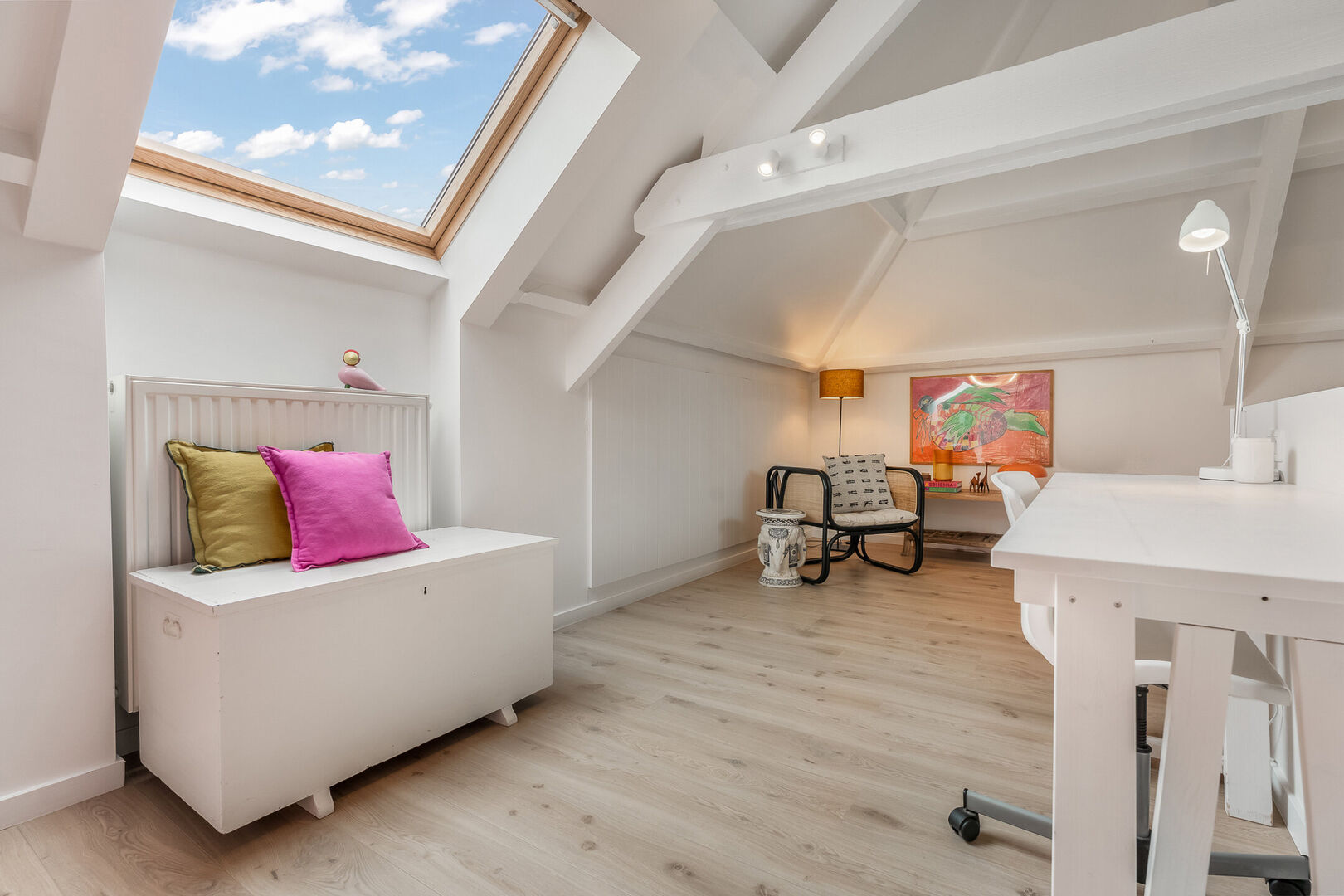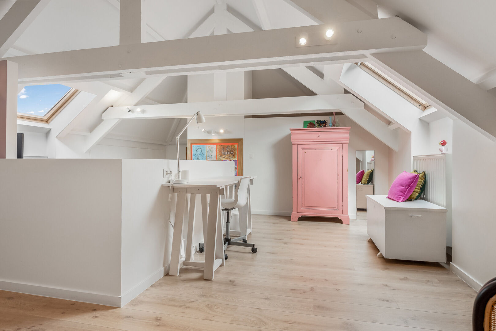-Deze tot masterbedroom omgetoverde zolderkamer van maar liefst 49,39m2 combineert charme met een karaktervolle afwerking en een overvloed aan natuurlijke lichtinval. Ook de nokhoge plafonds zorgen voor die extra touch. Ideaal als creatieve werkplek, hobbyruimte of mogelijk twee extra slaapkamers.
