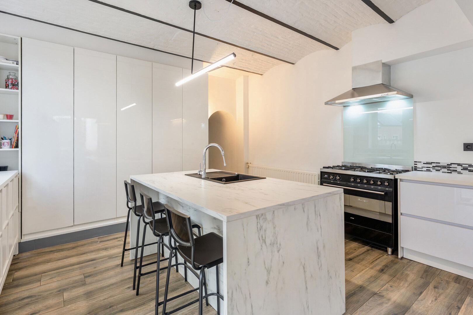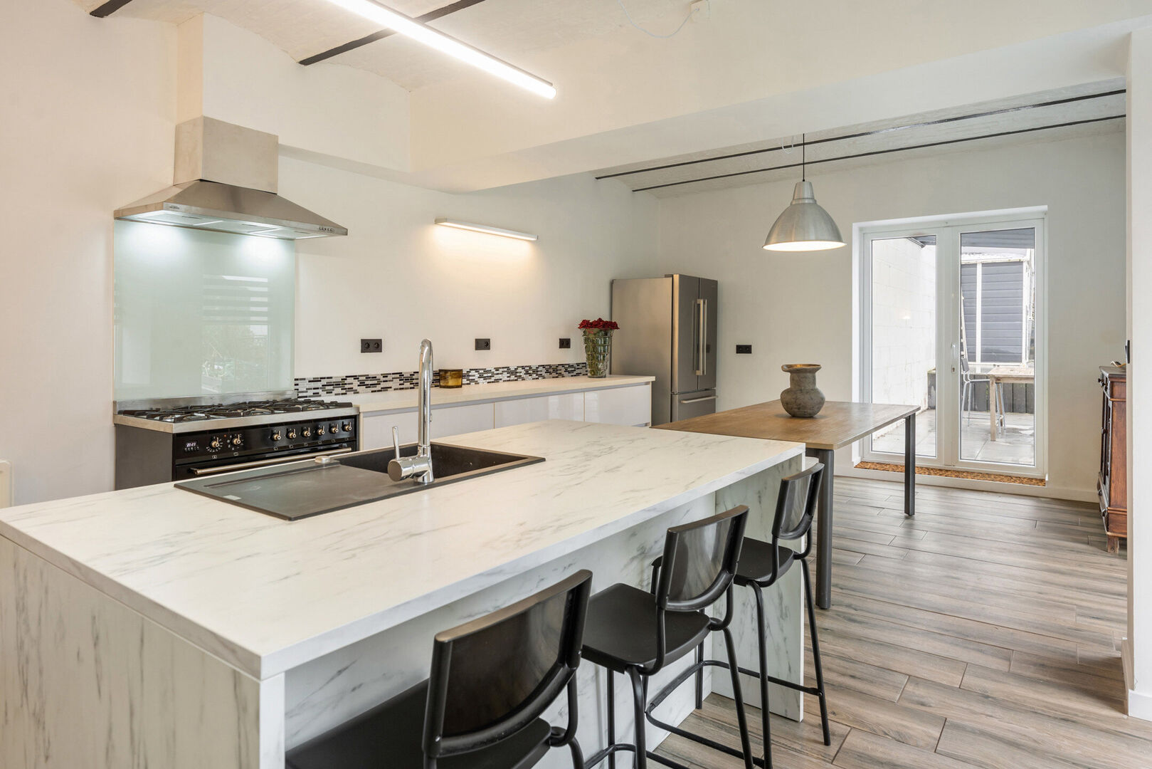 -Royale leefkeuken van maar liefst 32,57m2 gekenmerkt door vele raampartijen en een aangenaam zicht op de achtergelegen tuin. Hier geniet je niet enkel van een compleet uitgeruste keuken (gasfornuis met oven, combi-oven en een vaatwasser), maar ook van een charmante eethoek en meerdere maatwerkkasten. Van hieruit heb je evenzeer toegang tot het overdekt terras (12,04m2).