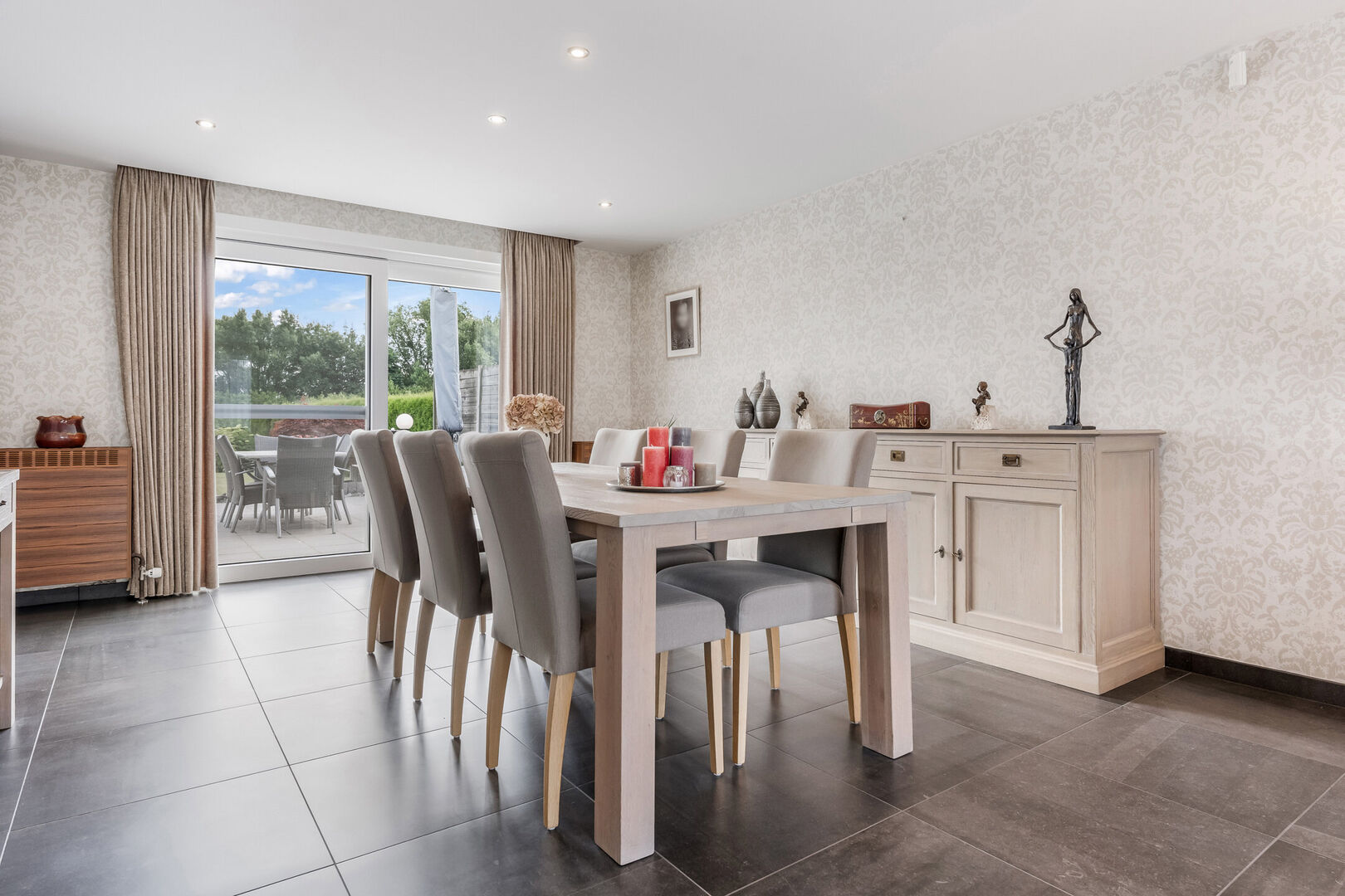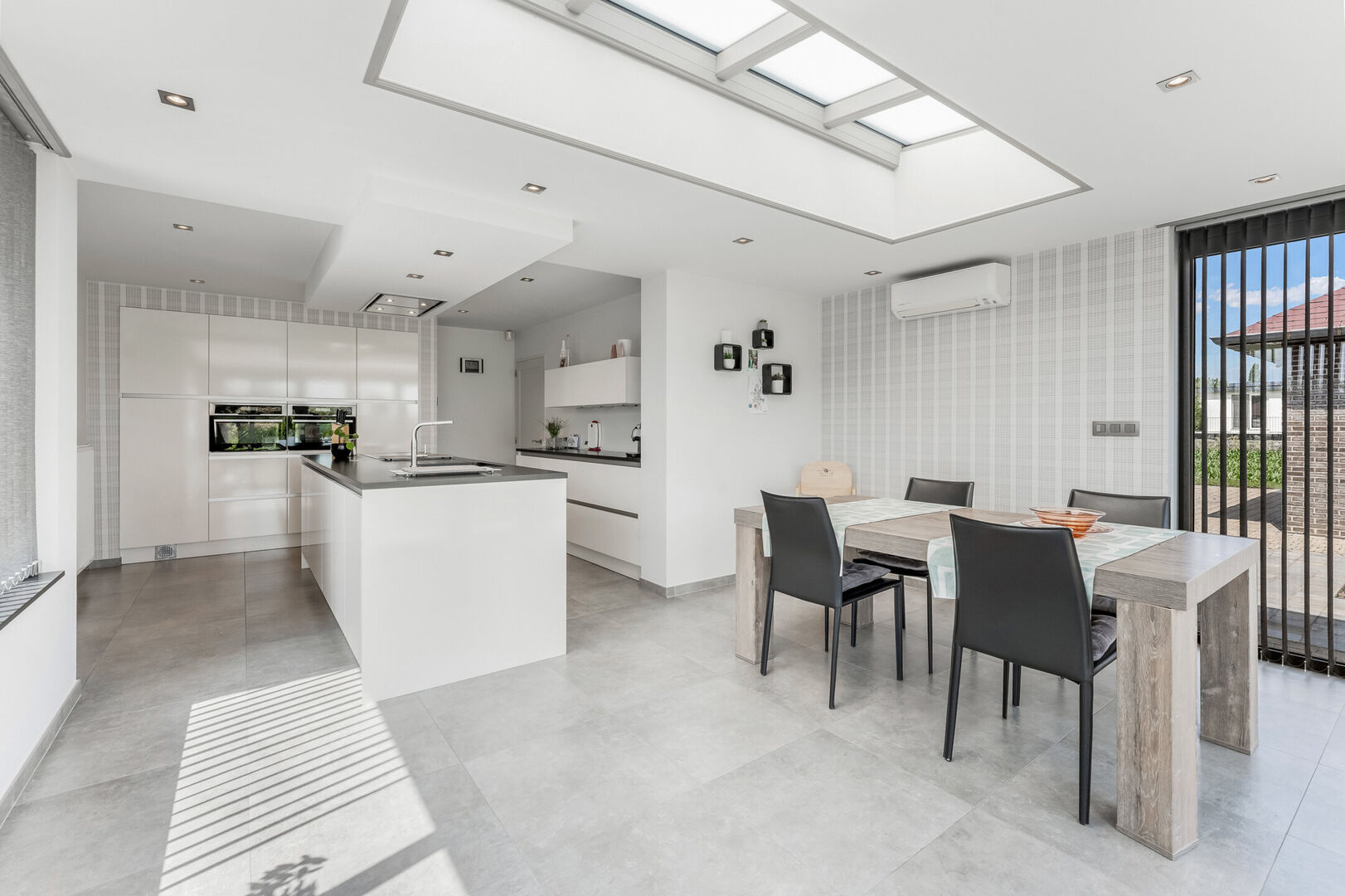 -Magnifieke open keuken (35,6m2) met veranda die een aangenaam zicht biedt op de achtergelegen tuin en velden. De luxueuze keuken is voorzien van keram. kookplaat, afzuigkap, microgolfoven, combi-stoomoven, vaatwasser en koelkast.