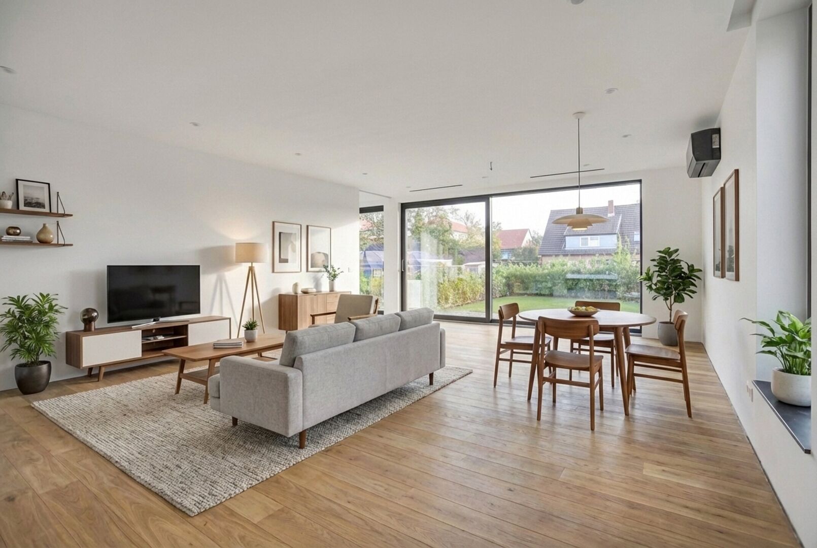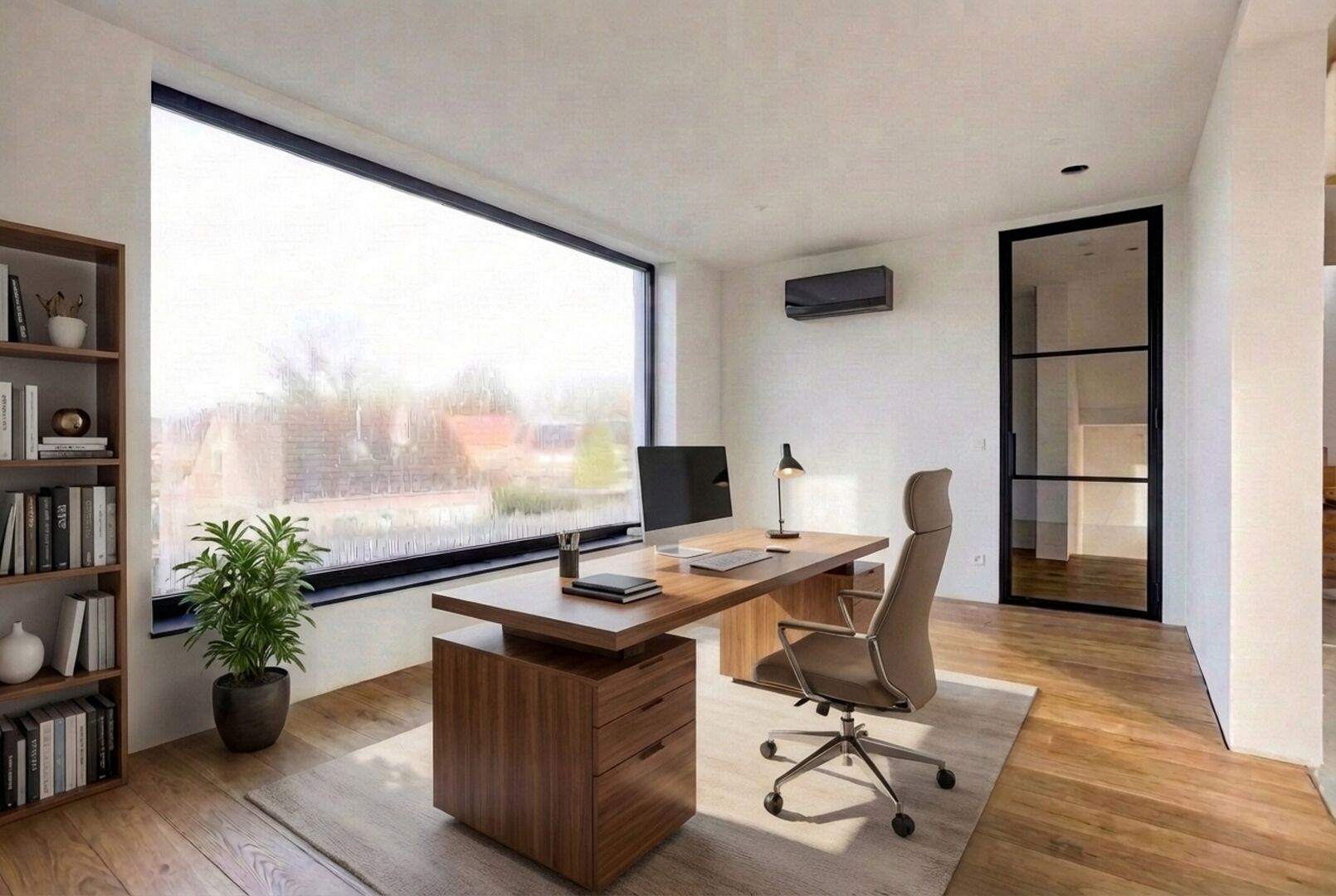 -Uitnodigende woonkamer(41m2) waarbij natuurlijk licht en een overvloed aan ruimte centraal staan. Daarnaast zorgt de openlijk onderverdeelde bureauruimte (18m2) voor de perfecte thuiswerkplek.